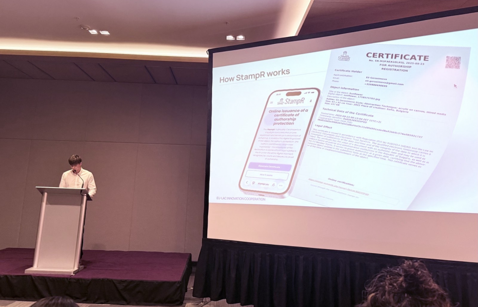 В рамките на форума Боян представи StampR – разработвана от него система за цифрово удостоверяване на авторство и време на създаване на цифрови произведения. Решението използва квалифициран електронен времеви печат по европейските стандарти и позволява на автори и екипи да докажат произхода и целостта на своите материали по надежден и публично проверим начин. Повече за платформата: https://stampr.eu