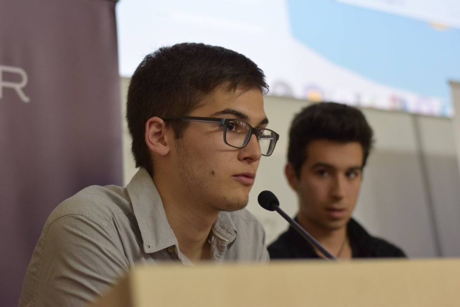 Пламен Нешков (вляво) и Любомир Кипров (вдясно) представиха своя проект като отбор „TUES Code Monkeys”.